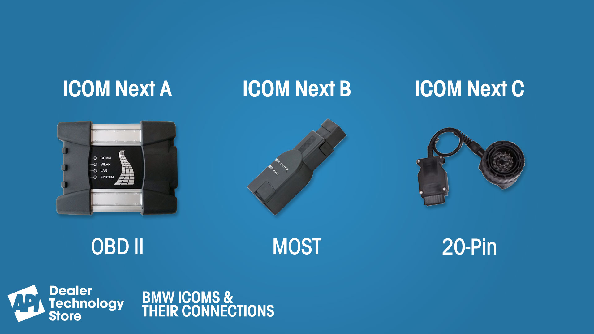 The A services the newest vehicles with an OBD connector. The ICOM Next B connects to vehicles with a MOST connector. The ICOM Next C connects to vehicles with the older 20-pin connector.
